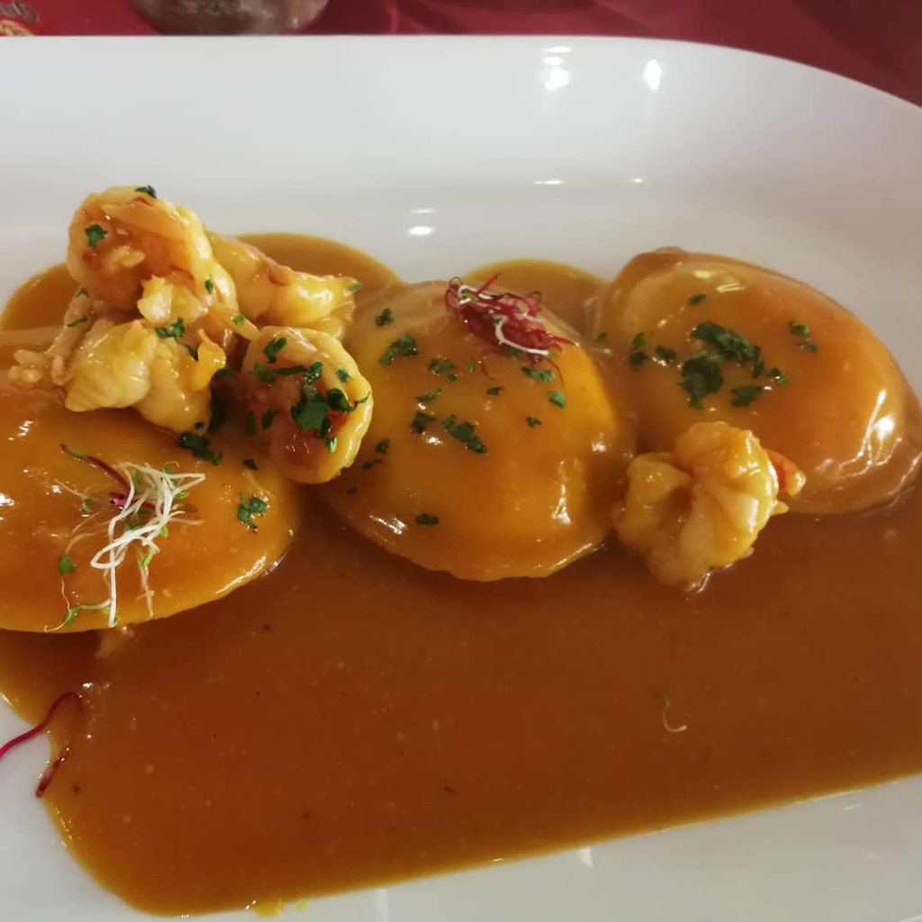 Diverso il discorso per i ravioli. Il ripieno di capesante risultava cremoso e permeo del sapore ricco ed inconfondibile di questi molluschi. Riuscito anche l’abbinamento con la salsa di gamberi, piacevolmente sapida e ricca, assieme al ripieno danno vita ad un connubbio sensazionale, non presentando alcuna nota stonata, dove i sapori sono facilmente riconoscibili uno ad uno.