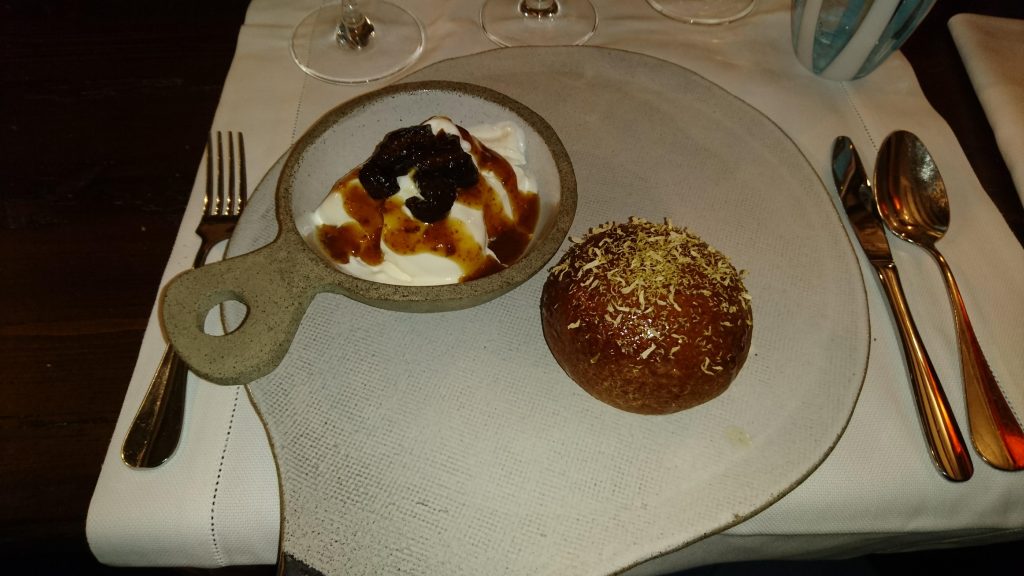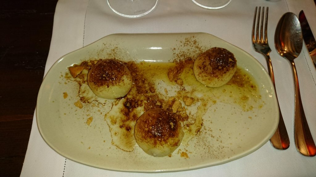 Gli gnocchi di susine, al contrario dei loro “colleghi”, spingono verso l’altro il sapore dolce. Sono dei veri e propri scrigni di patate con una intera susina al loro interno. Il condimento è a base di burro e cannella. Sono un piatto della tradizione anch’essi, partiti con un’idea ben precisa: Sfamare con quel poco che si ha. In questa versione più “gourmet” non vengono snaturati affatto, e si possono definire uno di quei piatti che ti lasciano soddisfatto, grazie alla loro avvolgente dolcezza. Avrei, personalmente, preferito un contrasto più marcato nelle consistenze, dato che il pane tostato si “beve” un po’ il burro, diventando morbido come lo stesso gnocco, ma non voglio essere frainteso, non si tratta di un difetto, solo di una preferenza personale, che non abbassa l’opinione nei confronti di un prodotto molto ben fatto.