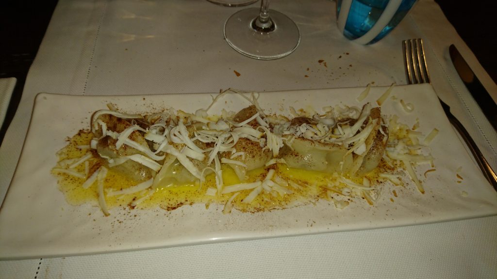 Accomunerò i due primi piatti scelti per la serata, iniziando dai Cjarsons (questi almeno so come si pronunciano). Fondamentalmente di tratta di un raviolo realizzato in pasta di patate ripieno di erbe spontanee, farina di carruba e menta, condito con burro, cannella e scaglie di ricotta affumicata. Questo piatto tipico delle alpi carniche gioca molto sul contrasto tra dolce e salato, in cui un po’ tutti gli ingredienti ci mettono del loro, a cominciare dai condimenti. La ricotta affumicata alza il livello di sapidità, mentre burro e cannella di aspetteresti di trovarli più in pasticceria che in un primo piatto. Agli occhi di un toscano, conoscitore dei tortelli di patate, i Cjarsons si presentano come una buffa inversione dei ruoli (pasta di patate e farina nel ripieno), ma il tutto funzione molto bene. Il sapore piuttosto delicato non viene minimamente tramortito da gusti forti.