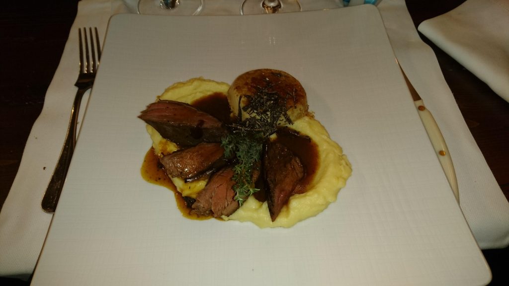 La mia scelta per la portata principale si è diretta verso questa proposta fuori menù: Filetto di cinghiale con purè di patate e fegatini. Devo ammettere di aver fatto un’ottima scelta. In Toscana ho mangiato cinghiale molte volte, ma mai in “purezza”. Il filetto si presenta lievemente rosa, più avanti di una cottura media ma non arriva al ben cotto. Questo è sicuramente il grado migliore per poter gustare questa carne così complessa e, solitamente, molto dura. Riesce ad essere saporito e piacevolmente tenero, incredibile pensare che sia cinghiale, ma il sapore è inconfondibile. Praticamente perfetto. Se si prende in esame anche gli altri componenti del piatto si rimane piacevolmente stupiti da ognuno di essi. Il purè non presenta un elevato tasso di formaggio, risultando neutro e delicato, perfetto per non coprire il sapore del cinghiale. Un discorso analogo lo possiamo fare per il “budino” di fegatini, i cui sapore forte viene reso più lieve, e la consistenza particolare risulta un piacevole accompagnamento. La sapidità del piatto, però, non viene data da nessuno dei 3 coprimari finora citati, ma dalla salsa in cui sono immersi, semplicemente del liquido di cottura. Un piccolo capolavoro che non mi dimenticherò